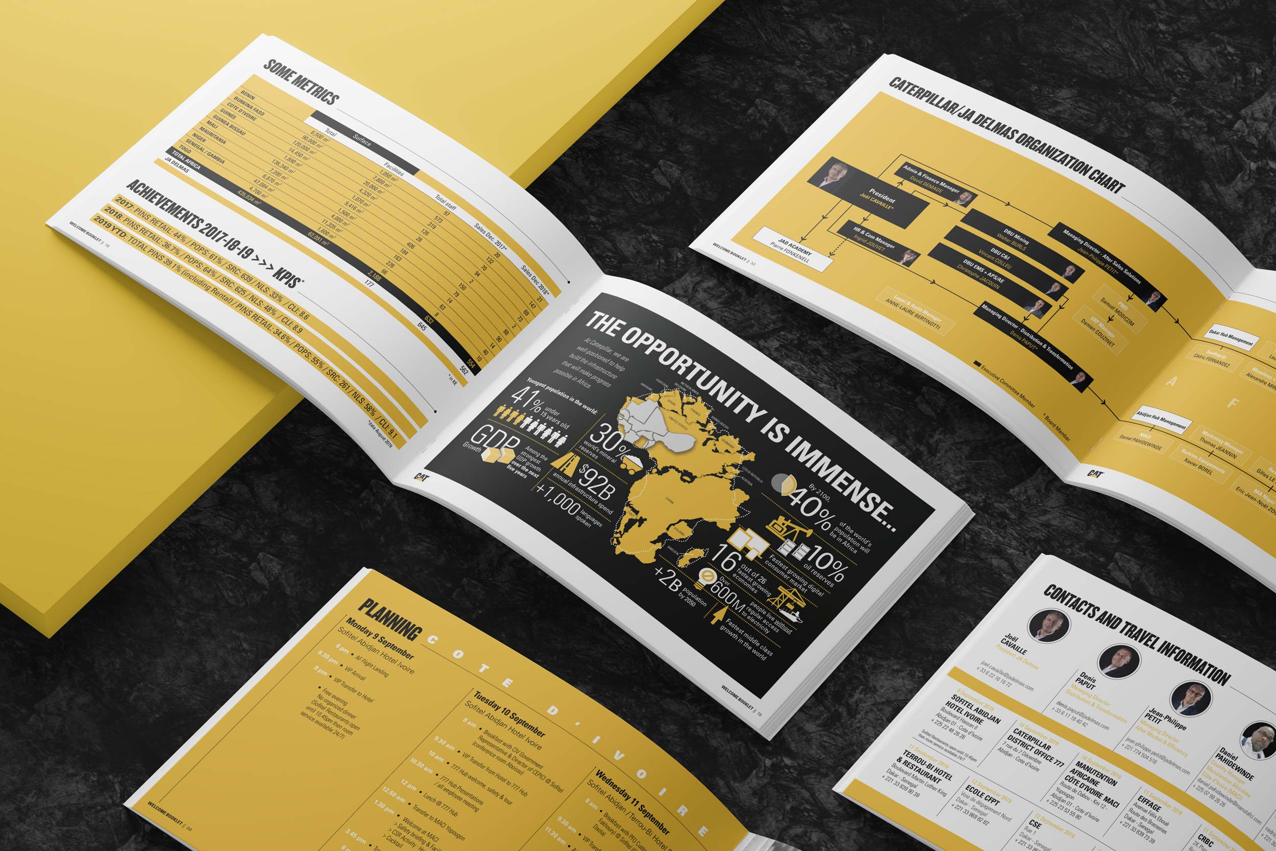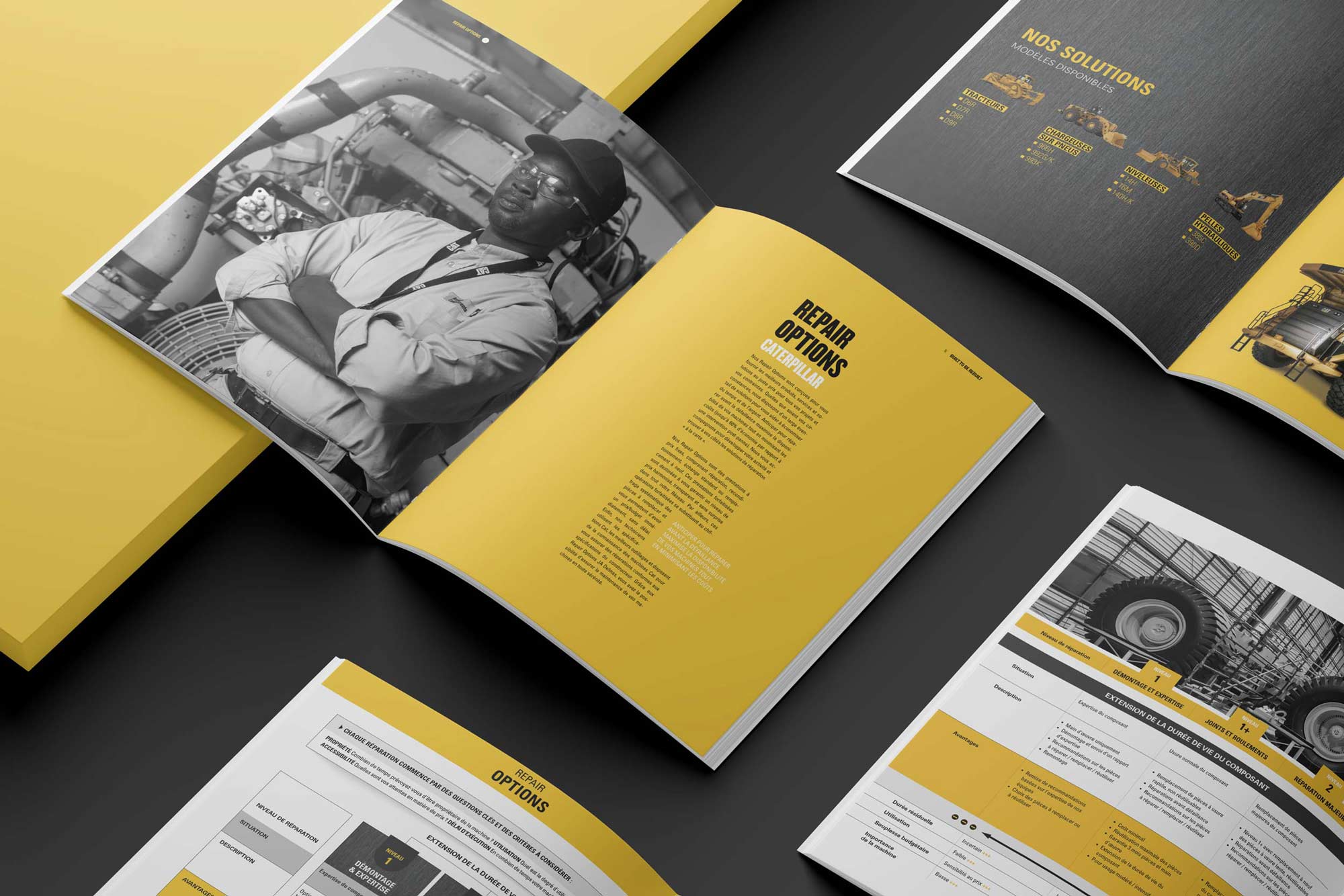 Notre intervention porte sur la structuration de l’information, la hiérarchisation des contenus complexes, l’adaptation des visuels techniques, et l’intégration rigoureuse des éléments de charte Caterpillar. Nous veillons à une mise en page claire, fonctionnelle et modulable, en tenant compte des impératifs multilingues, des conditions de lecture terrain et de la diversité des publics ciblés (commerciaux, techniciens, décideurs).