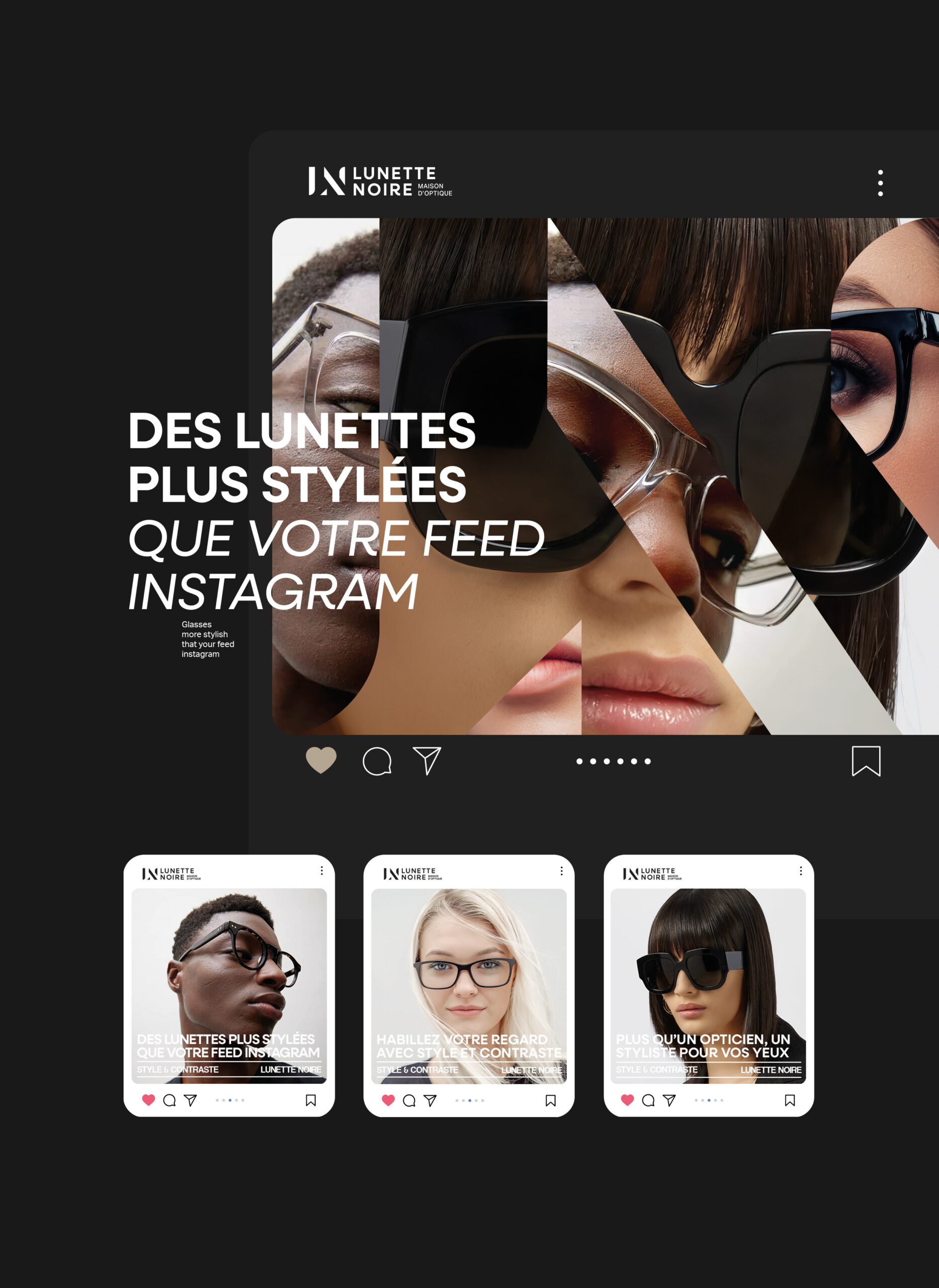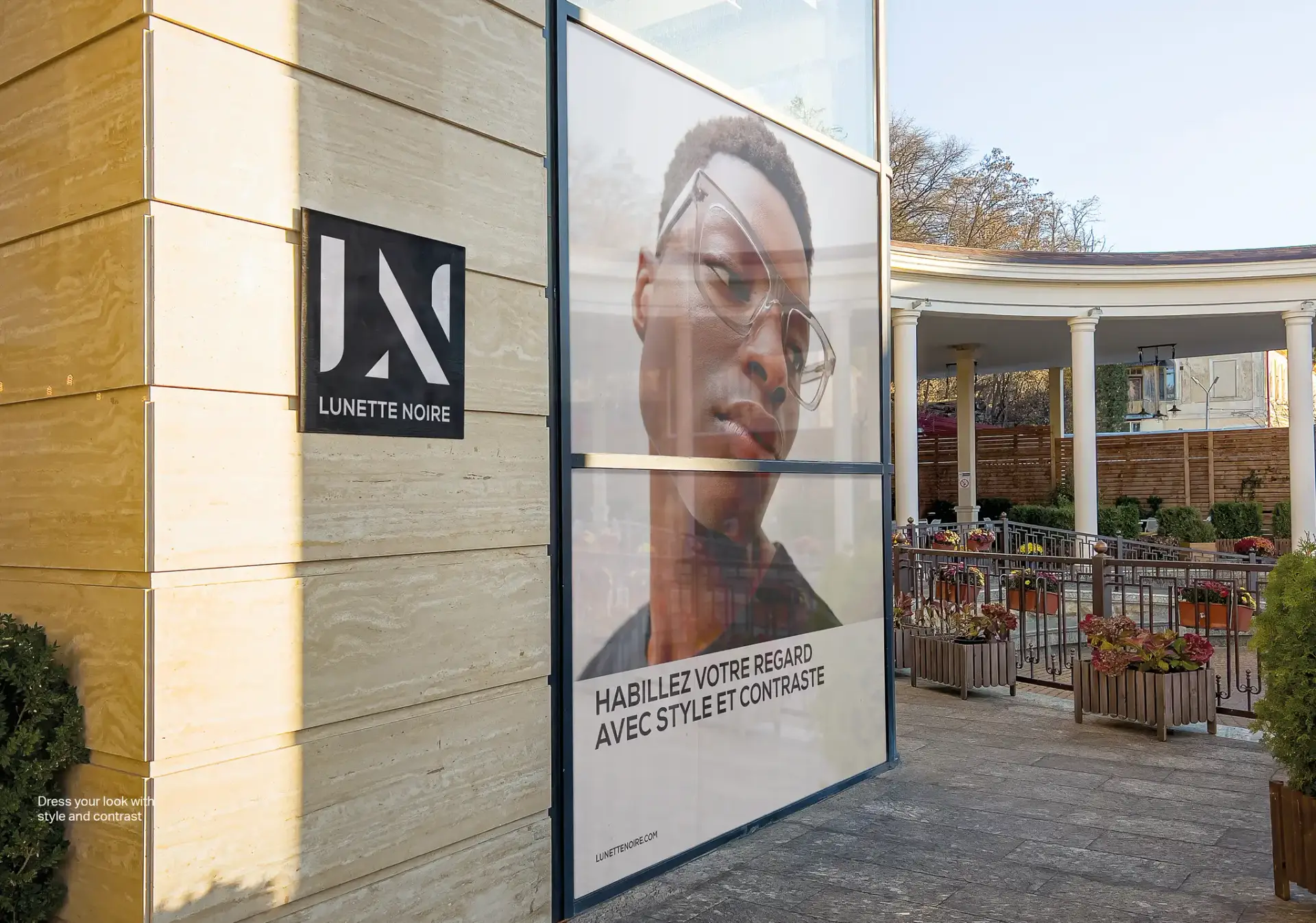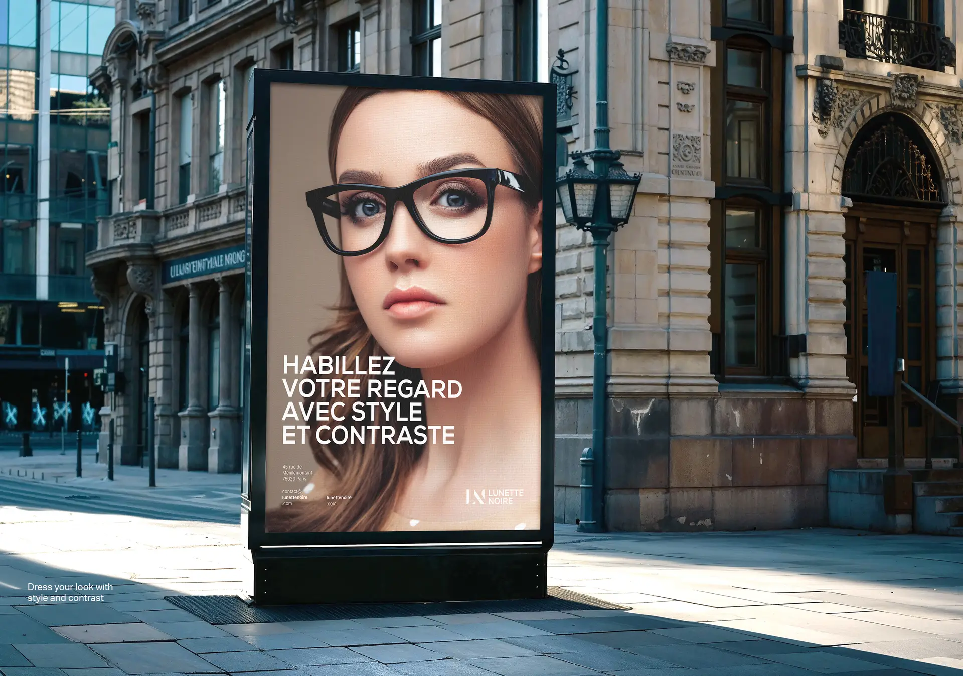 Pour la communication grand public, Bleu de Minuit a imaginé des visuels aux compositions originales, jouant avec les codes du graphisme, de la photographie d’objet et de l’affiche culturelle. Chaque visuel est pensé comme une micro-narration visuelle, où les lunettes deviennent prétexte à une mise en scène conceptuelle, parfois décalée, toujours précise. Ce parti pris affirmé permet à Lunettes Noires de se démarquer dans l’espace urbain, en cultivant une esthétique forte et identifiable, à la frontière entre design, art visuel et communication commerciale.